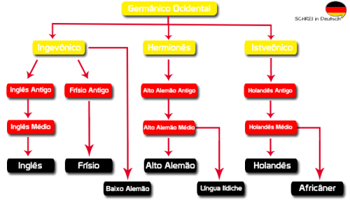 O Alemão ou Deutsch, pertence ao Grupo linguístico: Germânico Ocidental, que evoluiu do Protogermânico, língua "descendente" do Proto-Indo Europeu (chamado de PIE), passou por mais de 20 Séculos de evolução até chegar no Atual Alemão (O Padrão na Alemanha é o HochDeutsch, que se dividiu em diversos dialetos, como por exemplo: